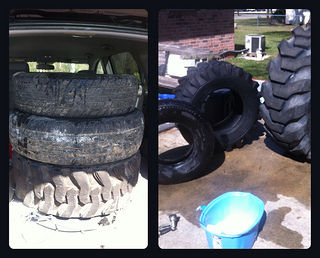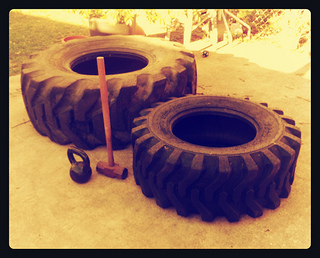 These are my big tires, the ones I hit and flip. I hit, do box jumps and (sometimes) flip the huge one. The smaller one is for flipping and throwing when I’m tired.