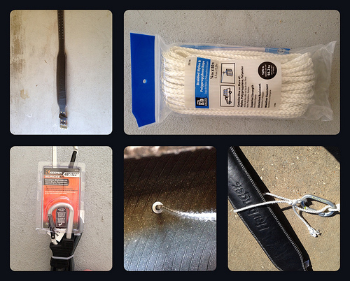 Here are the rest of your materials: rope. A 1/4in washer. A carabiner. A bungee rope with the carabiner attached to it. A weight lifting belt OR harness.