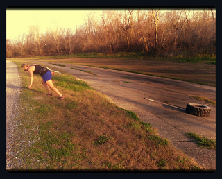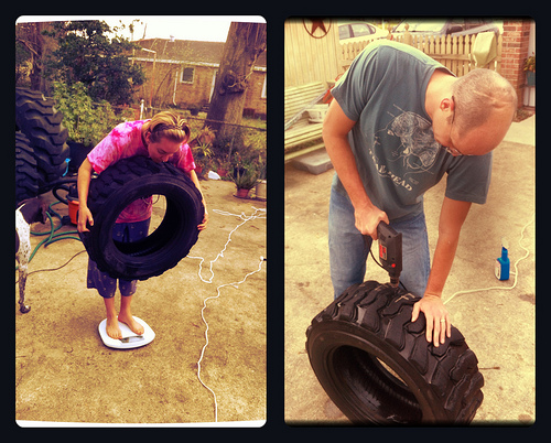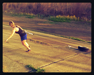 My friend Jacob sent a picture of a tire drag he made. I was floored. BRILLIANT! And who already has a tire junk yard in her backyard for flipping, for hitting with sledgehammers, for throwing…this girl! How had I not thought of this?! So, this week I was preoccupied with making the perfect tire drag(s) – plural because every girl needs assorted sizes.