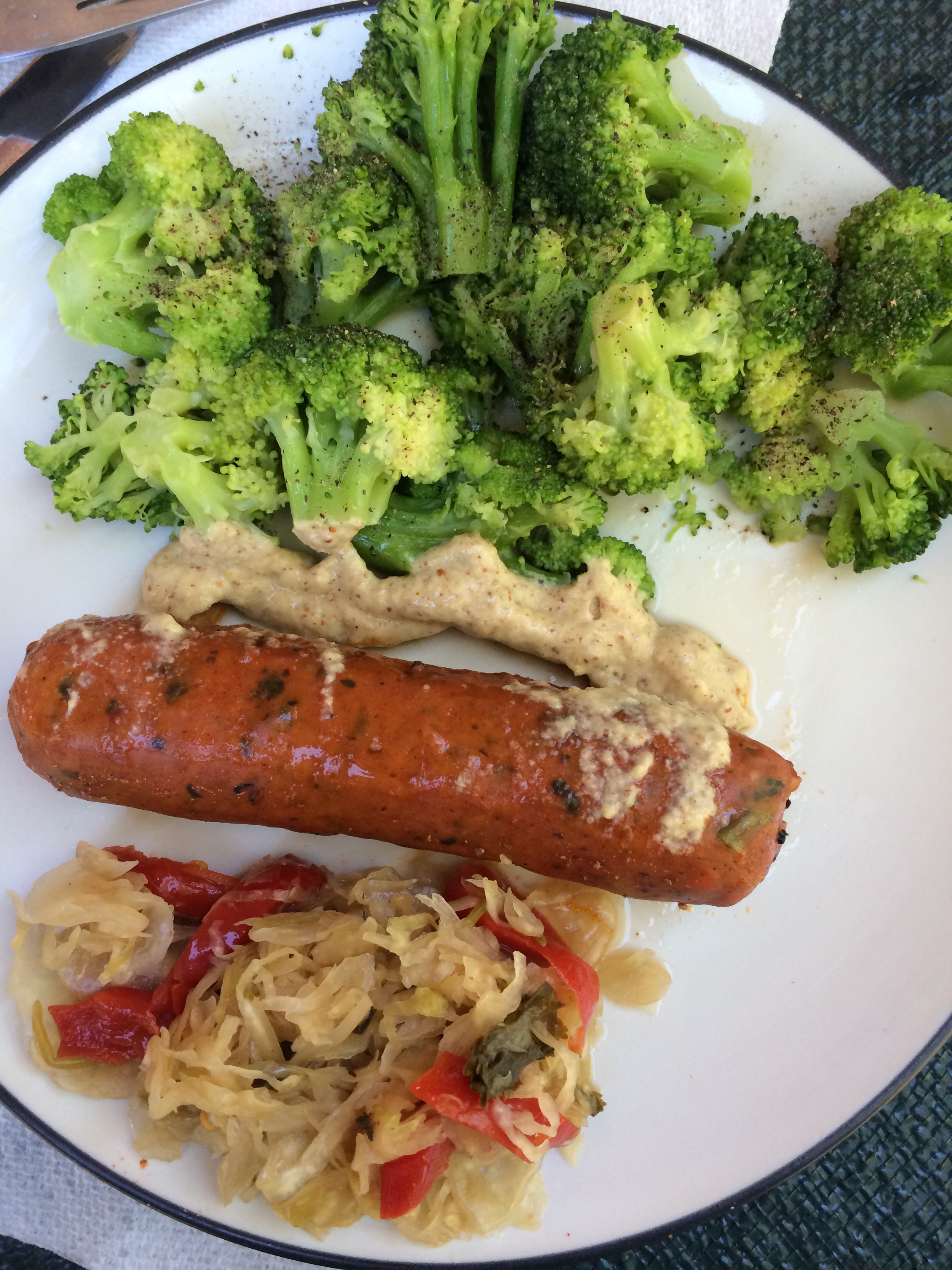 Chicken sausage from Costco, horseradish mustard and jalapeno kraut. Love it when one of my pics will be “ok” and then the shit rolls around and mustard falls off and gets all over the broccoli. Yay. I don’t even care if the pic looks like crap.