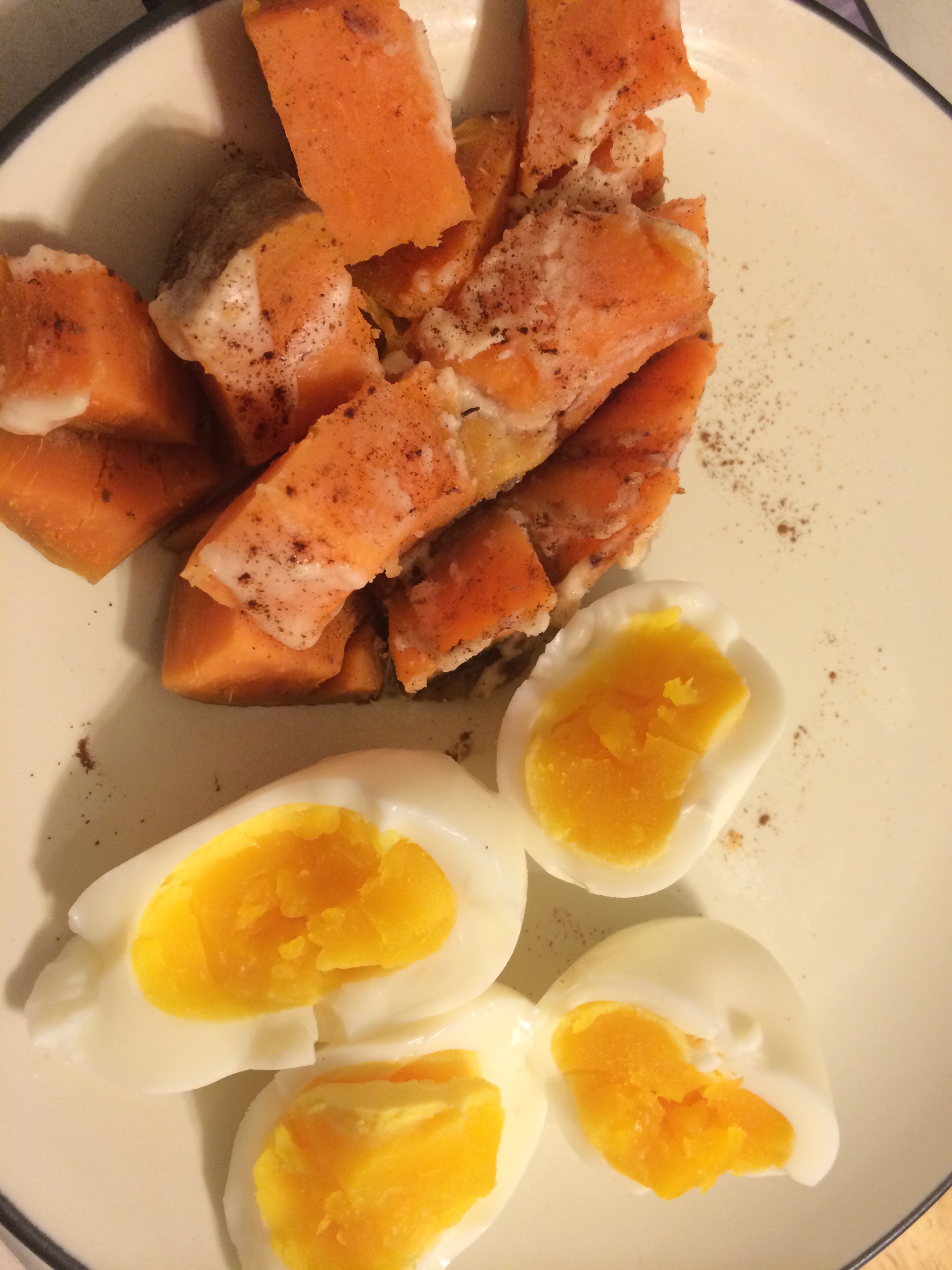 imageExcellent soft boiled eggs, 1/4 sweet potato with coconut cream & cinnamon.