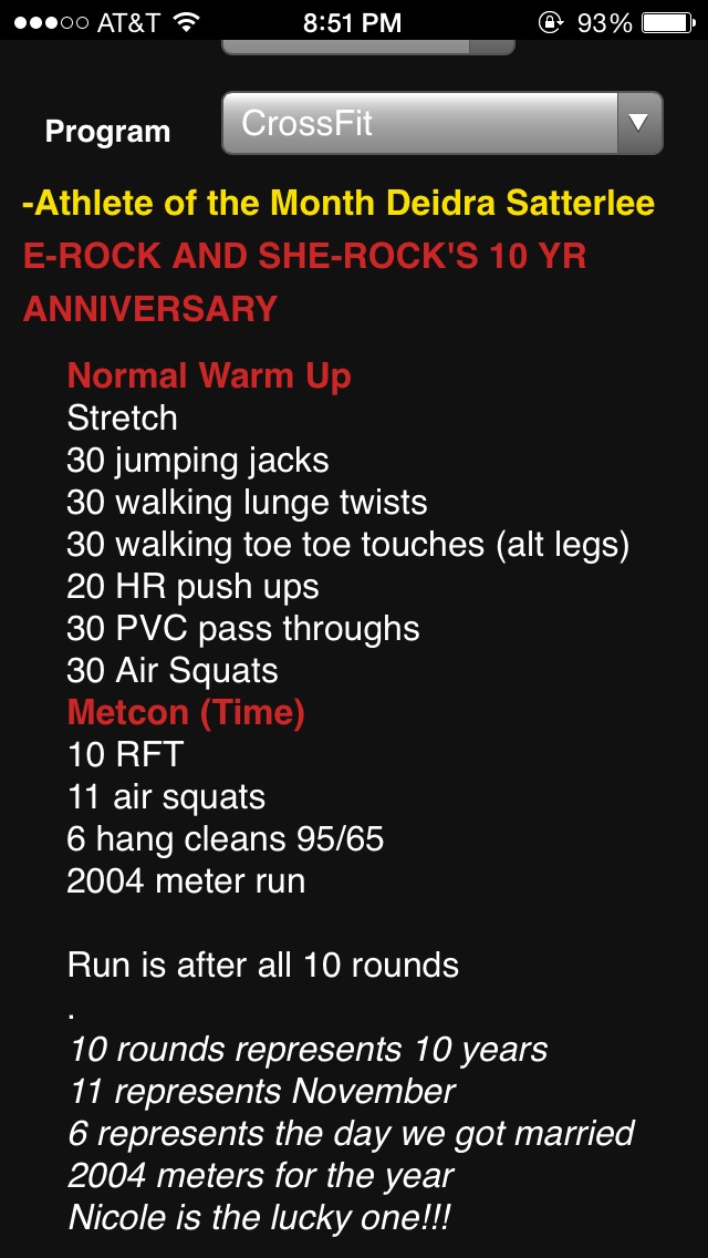 (10/27) We did Helen too. I love Helen. I am at least 2+ min slower than my PR. 😦 My pullups need some work, and my engine could be a little stronger, but I’ll get there.