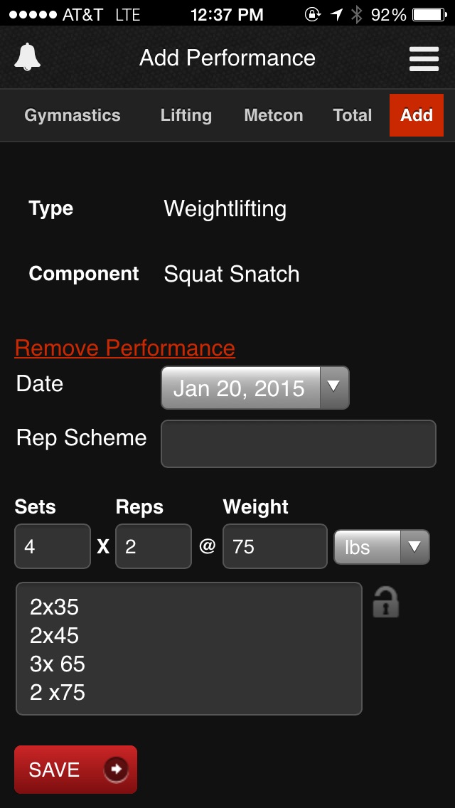Squat Snatch: 2x35lbs, 2x45lbs (way too easy), 3x65lbs, 2x75lbs.
