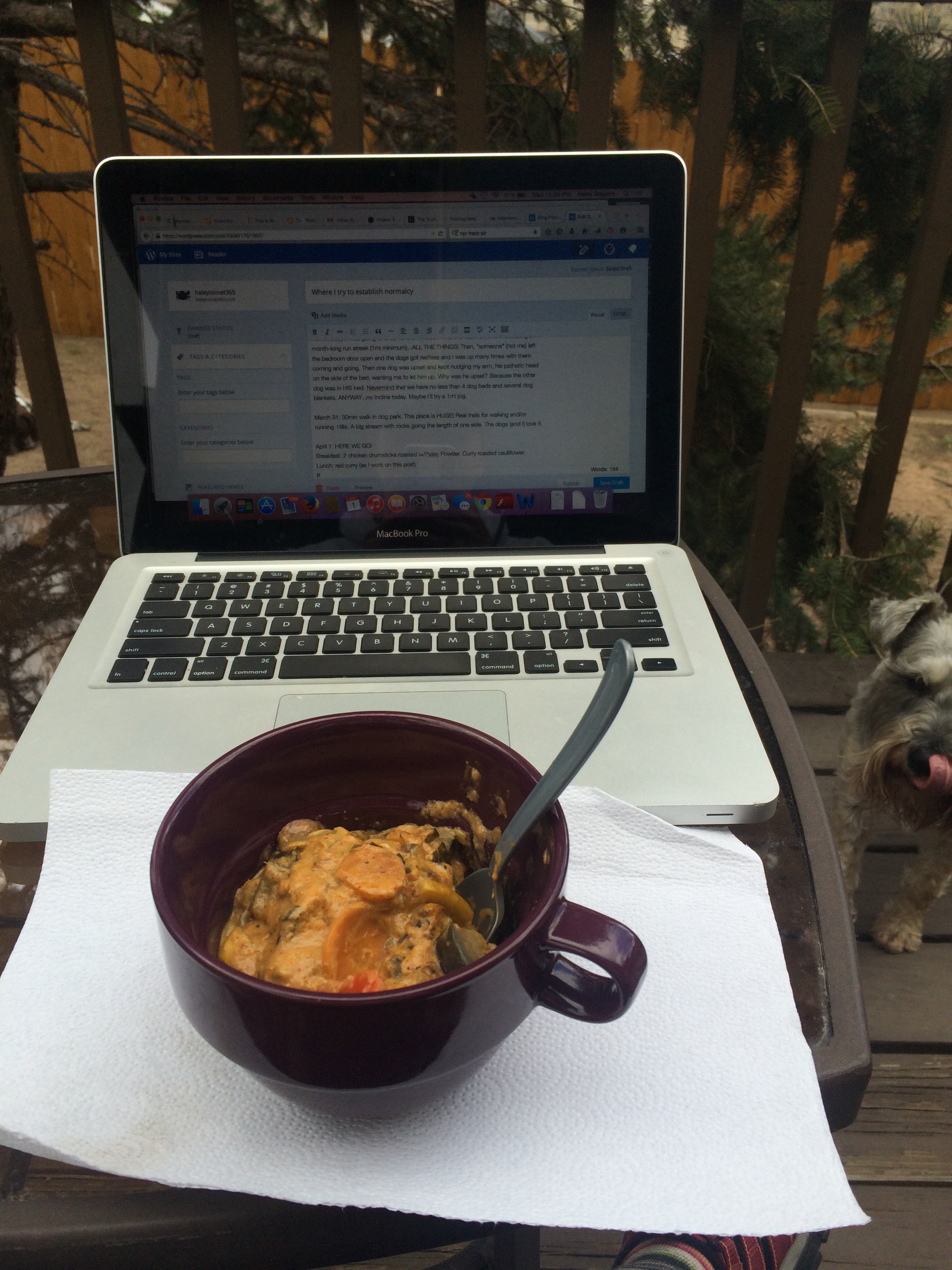 March 31: 30min walk in dog park. Stayed for at least an hour and read a book. This place is HUGE! Real trails for walking and/or running. Hills. A big stream with rocks going the length of one side. The dogs (and I) love it.