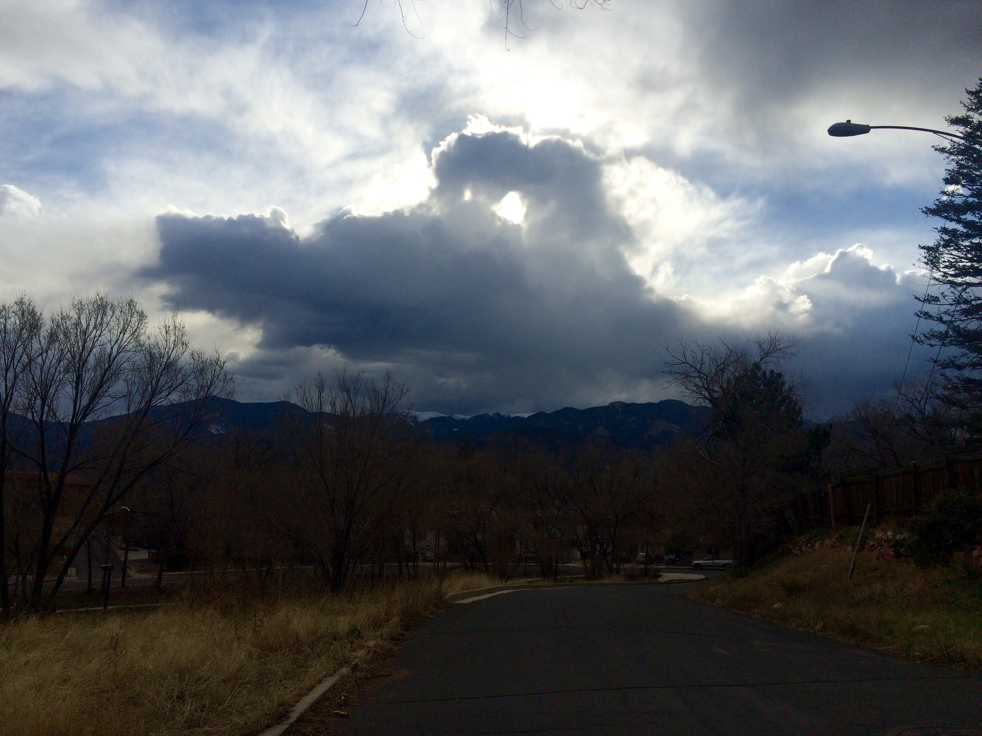 Shitty phone pic does this view no justice. Storm rolling in over Pikes Peak, taken at the start of my 1mi run. Beat the storm!